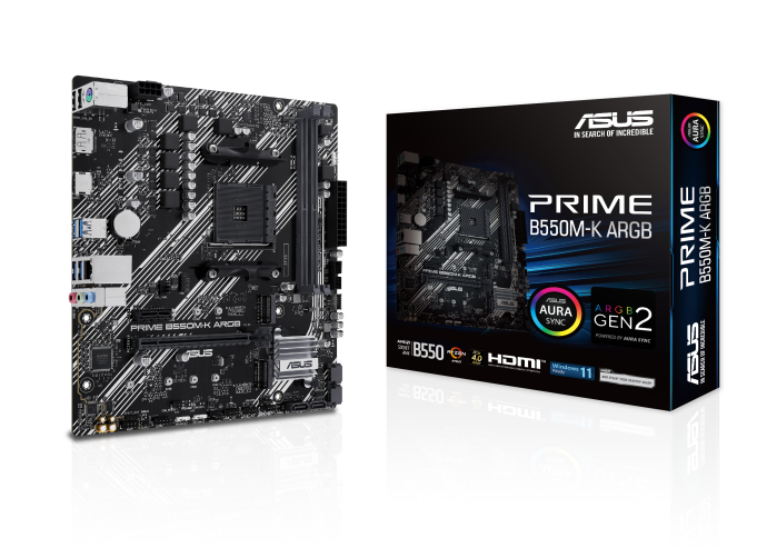 Asus PRIME B550M-K ARGB, AMD Socket AM4, B550, MicroATX, 2xDDR4, PCI Express, 2xM.2 + SATA3 RAID, HDMI/DP, USB 3.2, GigaLAN, Aura Sync