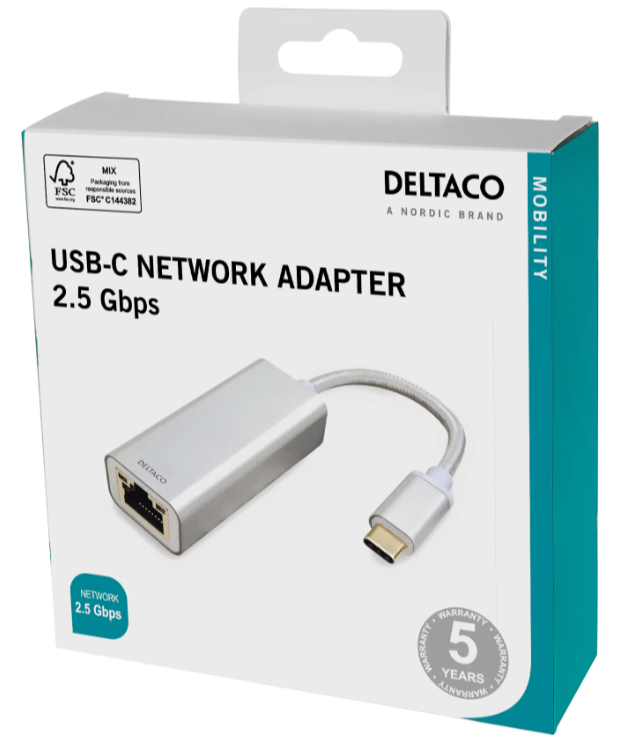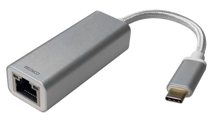 Deltaco USB-C nätverksadapter, 2.5GbE LAN, RJ45, aluminium