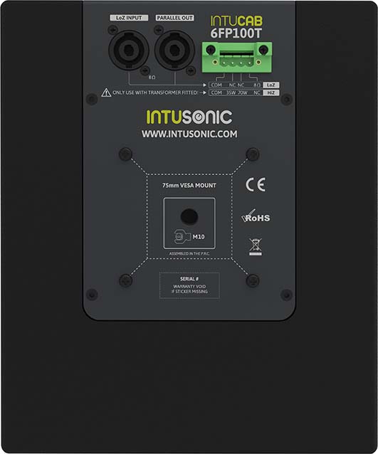 6FP100T/W har både speakon-anslutning (in/thru) samt Euroblock-anslutning. Lågohm, men kan användas i 100V-system med UTK60-trafon (tillbehör) som är förberedd för montering inne i kabinetten. Byggd i 12mm MDF med splatter-paint yta och heltäckande galler i stål.