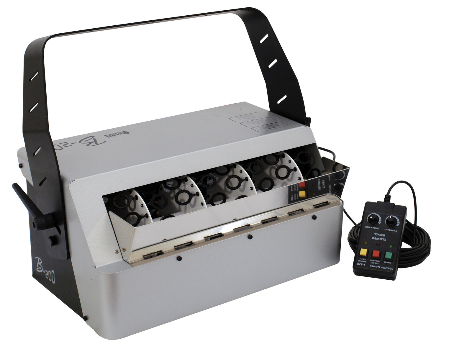 To say the B-200 is a high output bubble machine is too modest. It features four "double bubble wheels" which generate a massive, continuous torrent of bubbles. The set of three fans at the back of the unit spread the bubbles far and wide. Designed with lighting designers, large clubs and theatrical productions in mind, this bubble machine has DMX on-board. This provides for central control on B-200's bubble generation. The machine can also operate with/without optional timer and wireless remote controls. With its large fluid reservoir, the B-200 will pack the venue with bubbles as long as the party lasts.