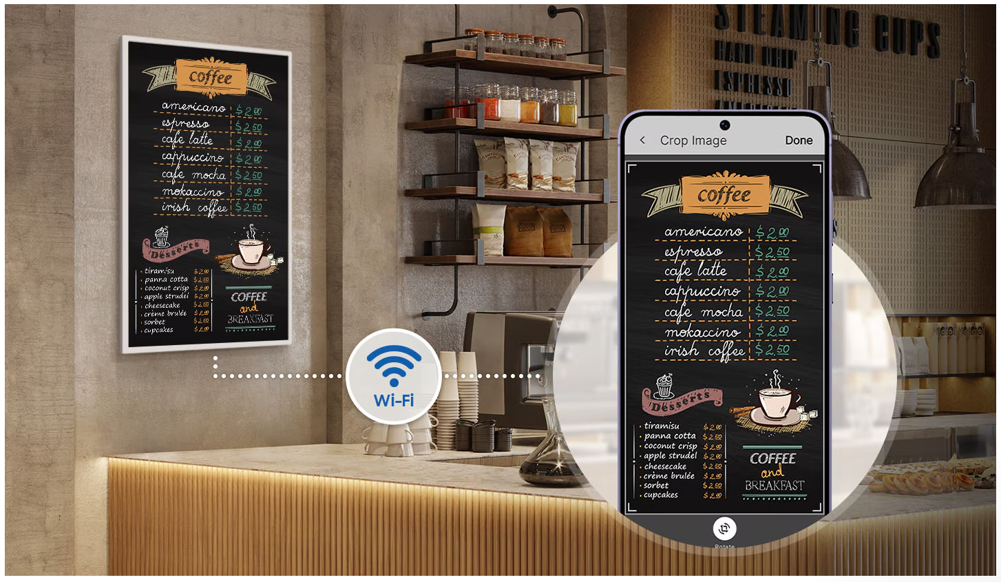 Tillgänglig för Android- och iOS-enheter – den dedikerade appen Samsung E-Paper gör det enkelt att styra EMDX-serien lokalt. Allt du behöver på ett ställe, från en första uppstart och parkoppling till att skapa innehåll och göra snabba uppdateringar.