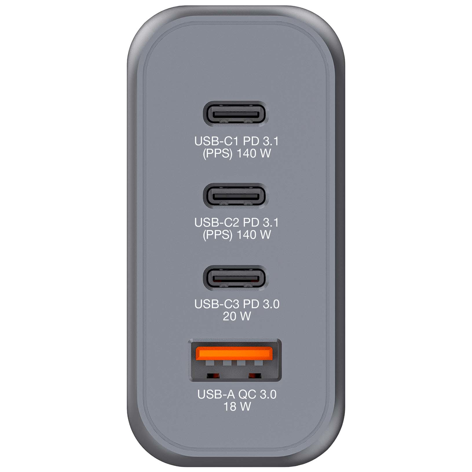 AC-adapter Verbatim GaN Charger 140W, 3xUSB-C / 1xUSB-A, inkl. reseadapter EU/UK/US