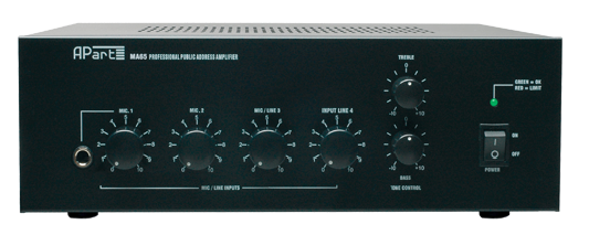Apart MA65 är förmodligen den mest kompletta och kompakta 65 watts 100 volts mixerbordsförstärkaren. Förstärkaren har 4 ingångar: 2 MIC, 1 MIC-LINE och 1LINE. Mikrofoningångarna kan ha fantommatning via en intern jumper.