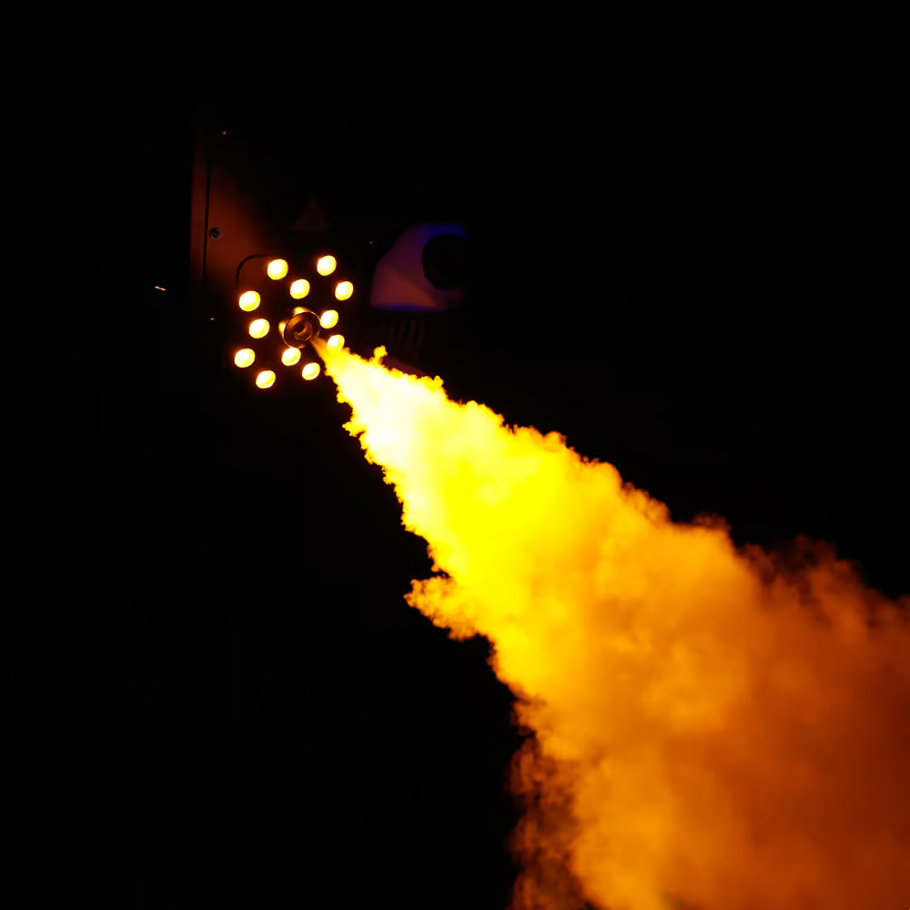 Att skapa spektakulära stämningar och effekter är en riktig höjdare med Cameo Steam Wizard 2000. Den producerar täta, jämna utbrott av vattenbaserad dimma med längder på 7 meter som samtidigt lyser upp av 12 kraftfulla 10-watts 4-i-1-LED-lampor för dramatiska scener och rika RGBA-färger. Med placeringsalternativ för vätsketanken upptill och nedtill möjliggör denna höghastighets vertikala dimmaskin både markdrift och enkel installation ovanför huvudet. Den kan även monteras horisontellt.
