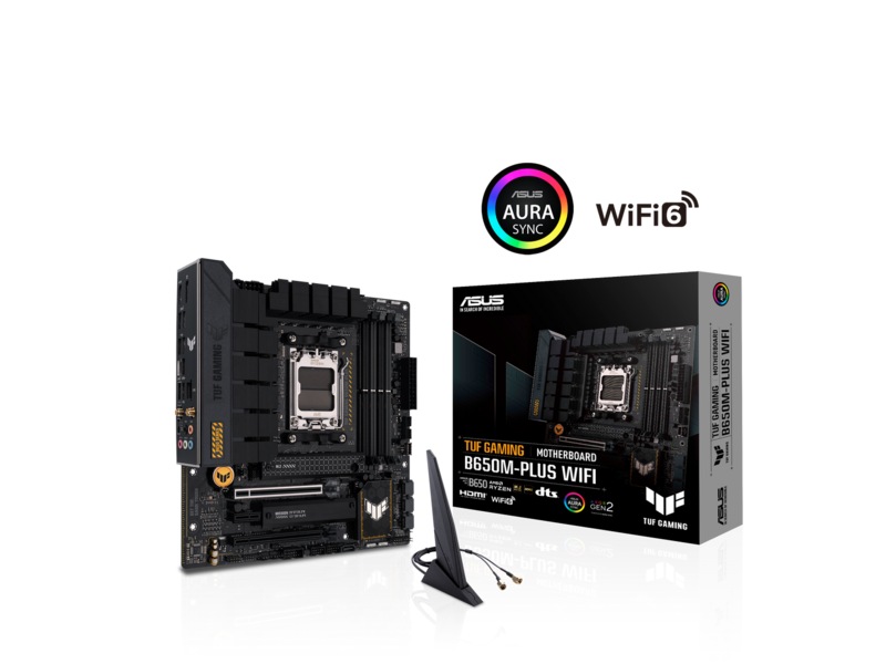 Asus TUF GAMING B650M-PLUS WIFI, AMD AM5, MicroATX, 4xDDR5, 2xPCI Express, 2xM.2 + SATA3 RAID, HDMI/DP, USB-C, 2.5Gbe LAN, WiFi 6, Bluetooth, Aura Sync RGB