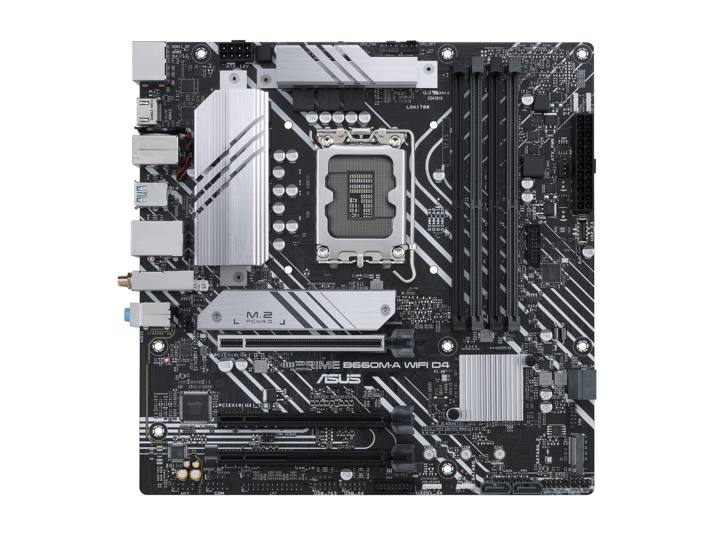 Asus PRIME B660M-A WIFI D4, Intel LGA1700, PCI Express, MicroATX, 4xDDR4, 2xM.2 + SATA3, 2xHDMI/DP, USB-C (front), GigaLAN, WiFi 6, Bluetooth, Aura Sync RGB