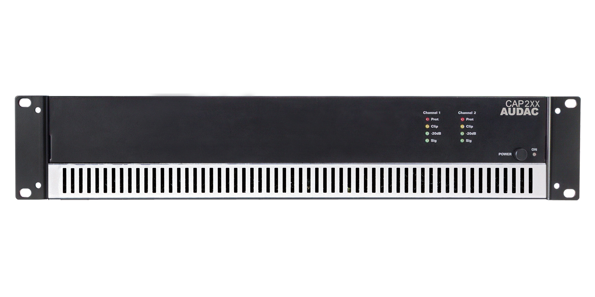 Audac CAP248 är ett 2-kanals 100V steg på 2 x 480W för större applikationer eller zonlösningar med många högtalare. CAP248 har balanserade ingångar och urkopplingsbart högpassfilter (400Hz) för varje kanal.