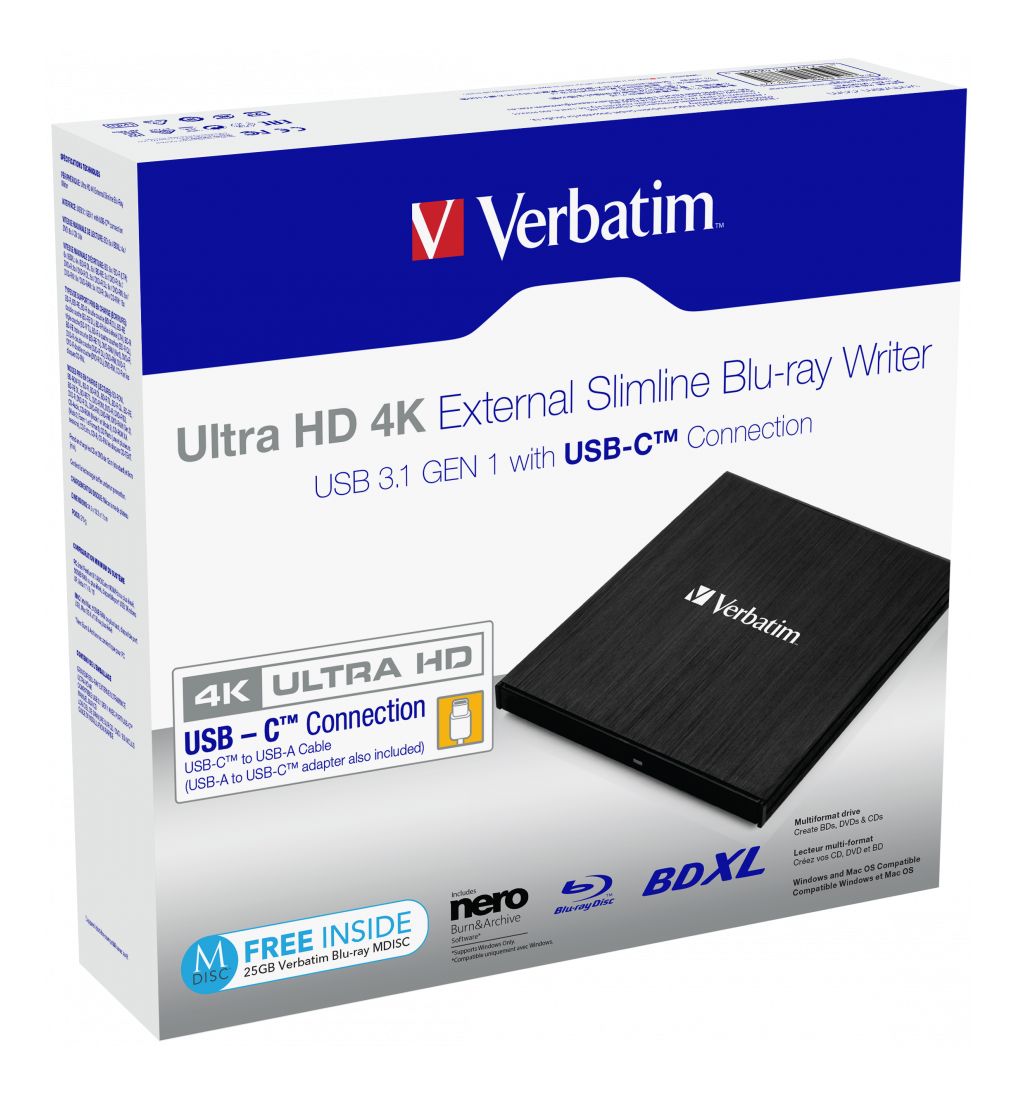 Verbatim Ultra HD 4K External Slimline, USB-C, inkl. 1x25GB Verbatim MDISC, svart