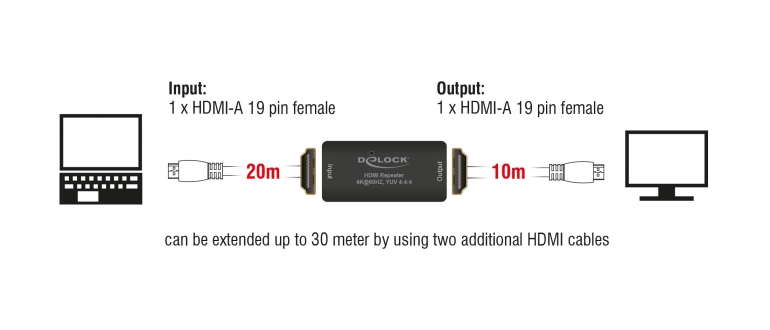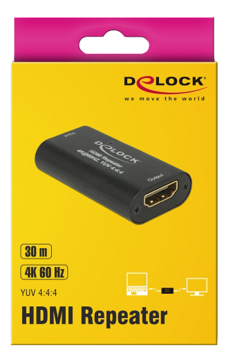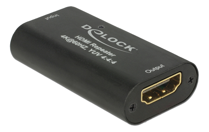 This HDMI repeater by Delock can be used for signal enhancement of an HDMI connection up to 30 m. An up to 20 m long cable can be connected from a PC or laptop to the input port of the repeater, and on the other side an up to 10 m long cable to the output port of the repeater, which is then connected to a display or TV. The repeater supports a resolution of up to Ultra HD (4K @ 60 Hz) and is downwards compatible to Full-HD 1080p.