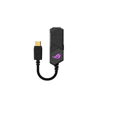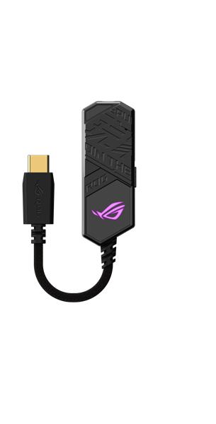 ROG Clavis USB-C till 3,5 mm spel-DAC med AI Noise-Canceling Mic, MQA-renderingsteknik, ESS 9281 QUAD DAC™, ljudförstärkare och Aura Sync. ROG Clavis är kompatibel med datorer, mobila enheter och bärbara datorer