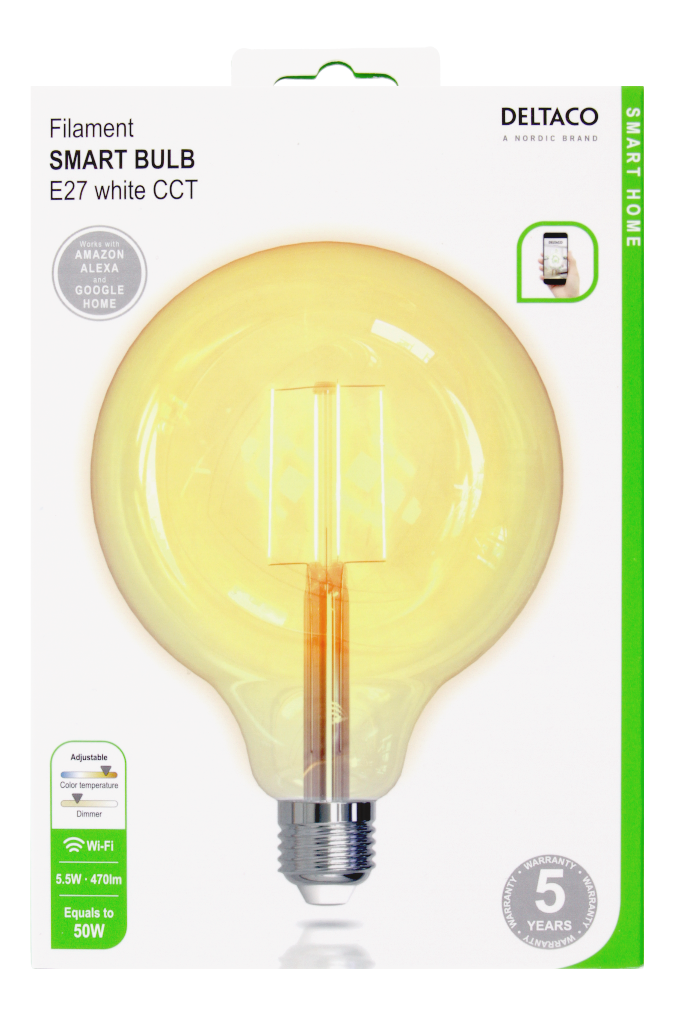 DELTACO SMART HOME LED-filamentlampa, E27, WiFI 2.4GHz, 5.5W, 470lm, dimbar, 1800K-6500K, 220-240V, vit