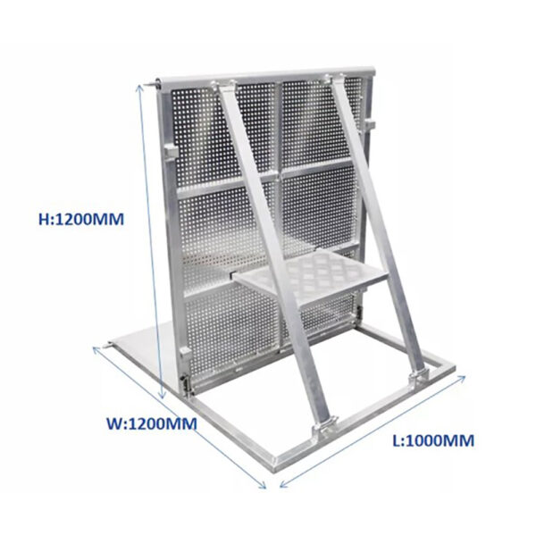 Kravallstaket i aluminium där alla hörn är rundade och framsidan är heltäckande för att skapa en säker och trygg mljö för arbetare och publik. Efter montering kan en arbetsplattform fällas upp så man kan hjälpa personer över vid behov, för publiken finns en stor fotplatta så staketen står stadigt.