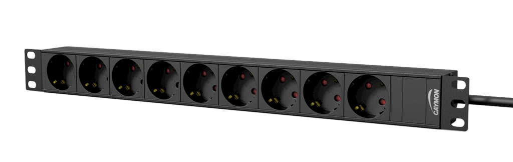Caymon PSR109G/B är en 19" 1HE strömlist / panel / PDU med 9st schuko-uttag på fronten.