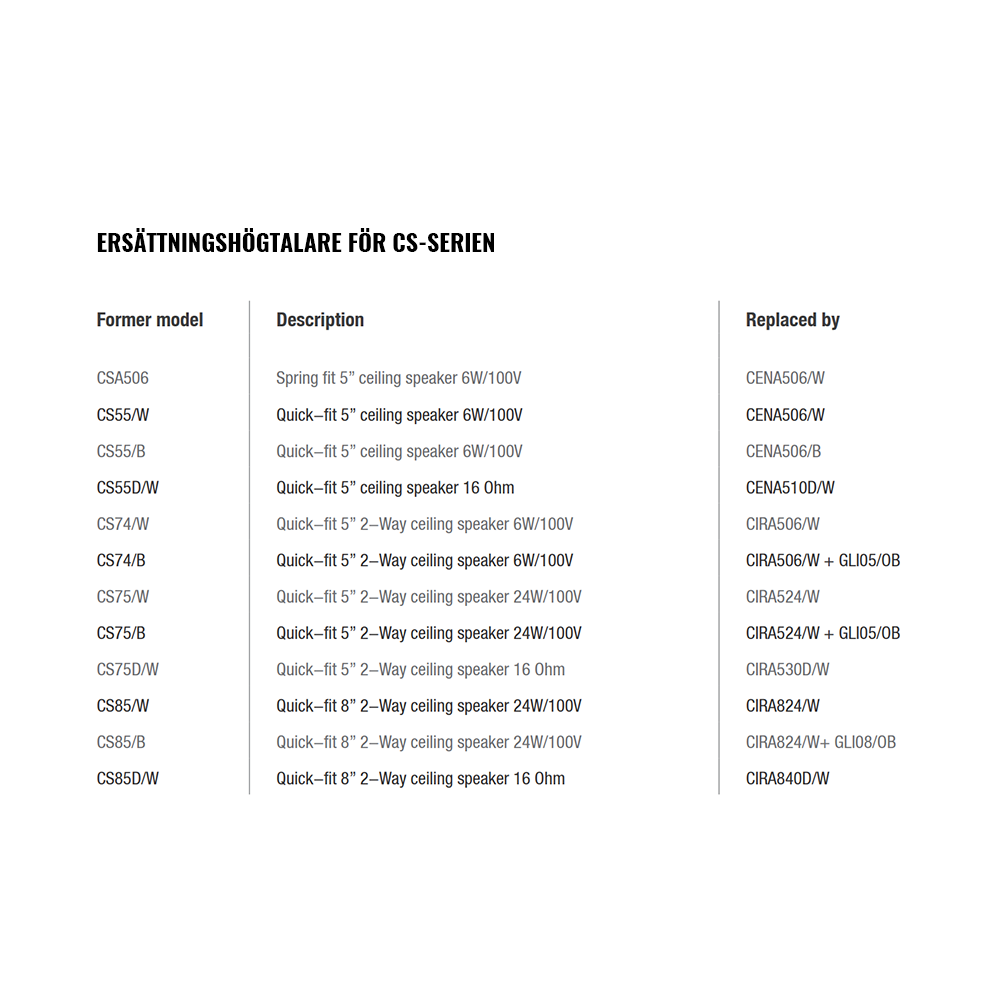 CIRA824i/W har en 8 tums polypropenkon i bas/mellanregister i kombination med en 1 tums Mylardiskant med fasplugg. Effekttåligheten är 40W RMS (max 80W) i 8 ohm, med 100V effekttuttag på 6W / 12W / 24W.