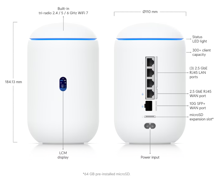 Ubiquiti Networks UniFi Dream Router 7, WiFi 7, 1x2.5GbE + 1x10GbE SFP+ WAN, 3x2.5GbE LAN (1 PoE)