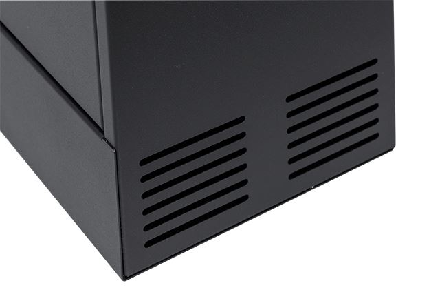 Knockout plåt för kabelgenomföring i bakplåten och plats för fläktar på vänster och höger sidan samt ventilationsgaller. Dörren kan öppnas i hela 90 grader vilket gör din installation enkelt och smidig.