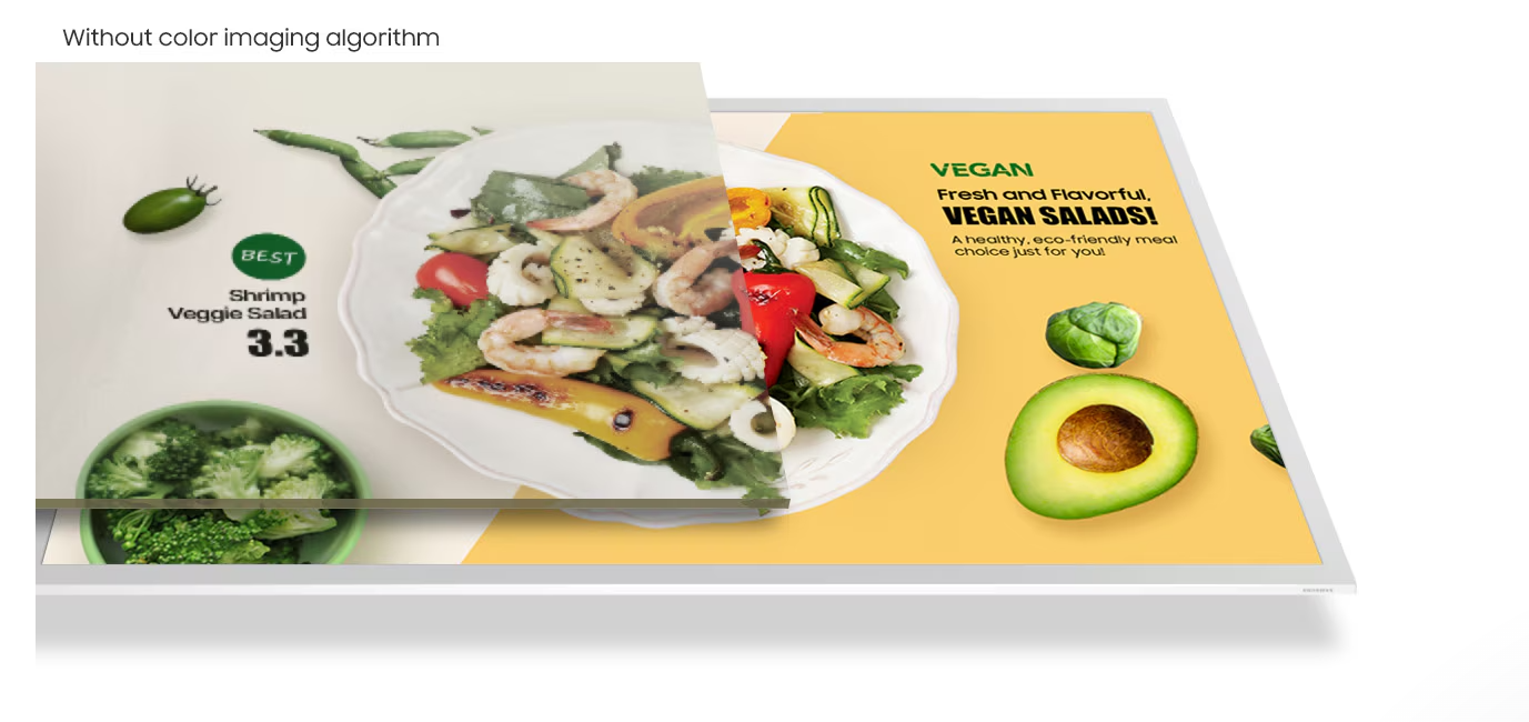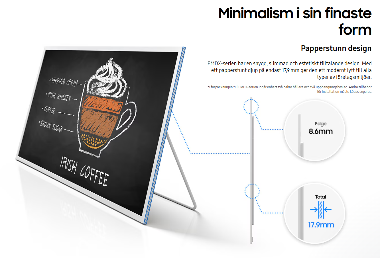 Med Samsungs expertis inom bildskärmsteknologi använder EMDX-serien en avancerad färgavbildningsalgoritm för att analysera innehållet och ge en pappersliknande visning. Dess reducerade konturer, mjuka tonövergångar och förbättrade färger gör den till ett alternativ till traditionella utskrifter som affischer och butiksmaterial