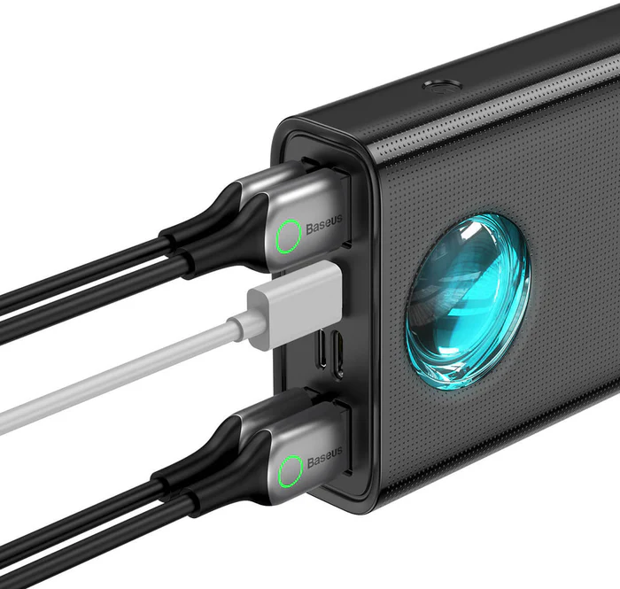 Baseus Amblight 65W Portable Charger Power Bank is a 30,000mAh capacity battery pack for fast charging laptops like a 13” MacBook Pro from 0 to 50% within an hour, and downward compatible with devices requiring less power output. It has 5 ports where all support power output and 2 supporting input.