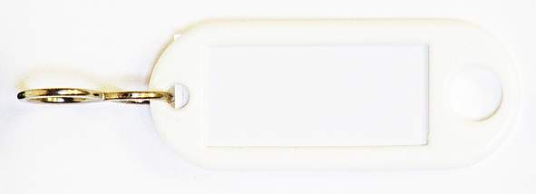 Nyckelbricka i plast med etiketthållare. Försedd med fönster och etikett och S-krok. Bricka: 54x21mm, etikett: 32x14mm. 100st/fpVit