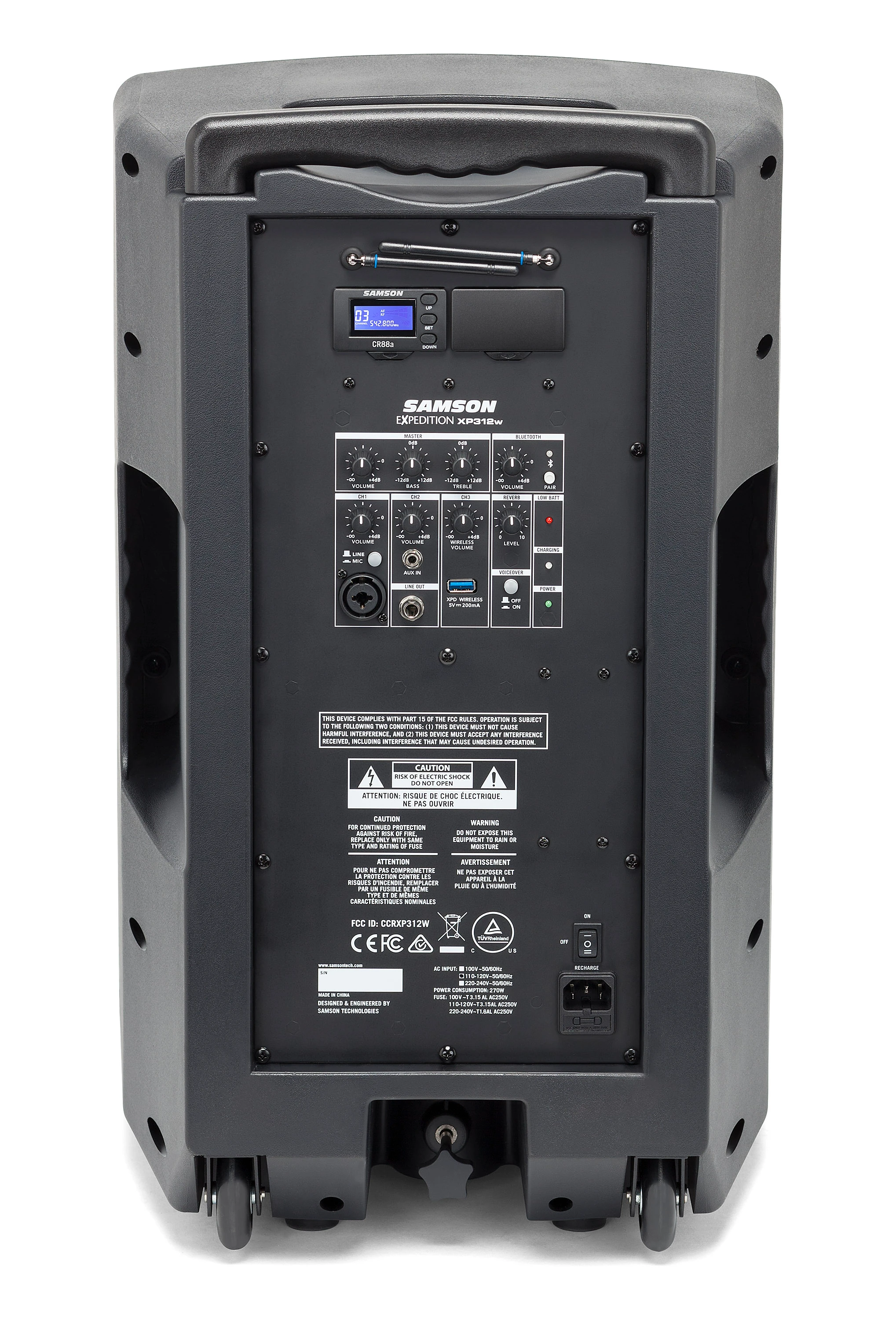 Samson XP312w, batterihögtalare, 12" + 1" tvåväg, batteri upp till 12 h, 4-kanals mixer (EQ, reverb, ducking), bluetooth, trådlös handmick ingår, hjul, teleskophandtag