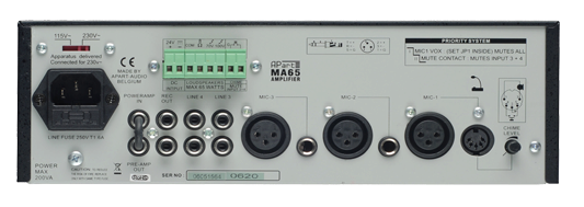 Apart MA65 är förmodligen den mest kompletta och kompakta 65 watts 100 volts mixerbordsförstärkaren. Förstärkaren har 4 ingångar: 2 MIC, 1 MIC-LINE och 1LINE. Mikrofoningångarna kan ha fantommatning via en intern jumper.