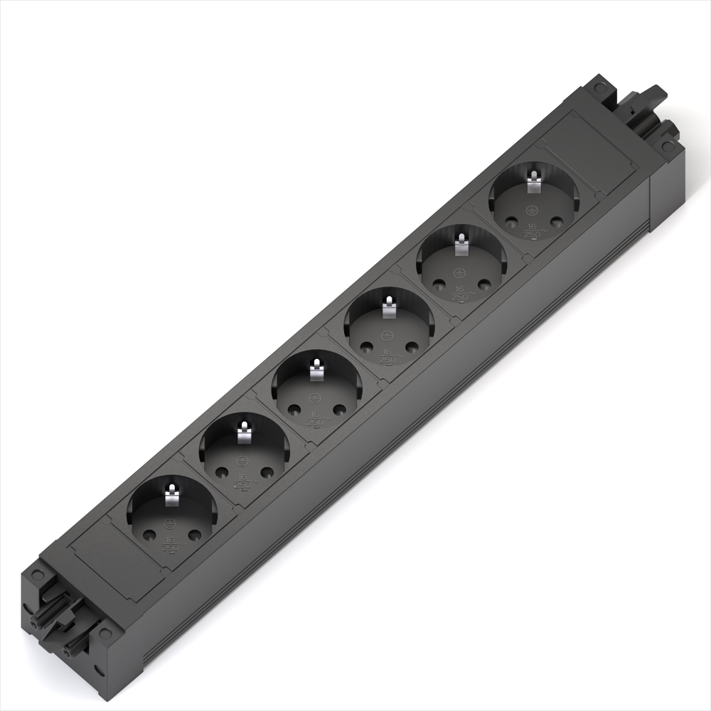 Axessline modulsystem för integrerade eluttag i t.ex. möbler. Anslutning med GST-systemet och går att trycka ihop till längre uttagsenheter helt utan verktyg. Anslutning på enhet är GST, komplettera med tillbehör GST-Schuko kabel.
