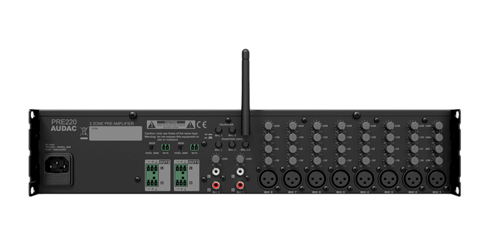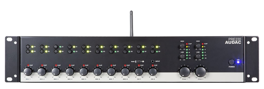 Audac PRE220, 2-zoners mixer, 19 tum med 8xMik/2xLine/Bluetooth