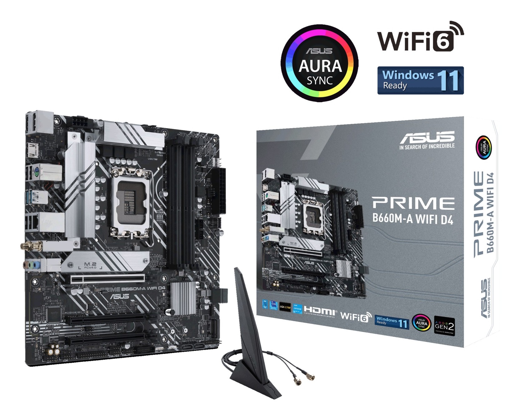 Asus PRIME B660M-A WIFI D4, Intel LGA1700, PCI Express, MicroATX, 4xDDR4, 2xM.2 + SATA3, 2xHDMI/DP, USB-C (front), GigaLAN, WiFi 6, Bluetooth, Aura Sync RGB