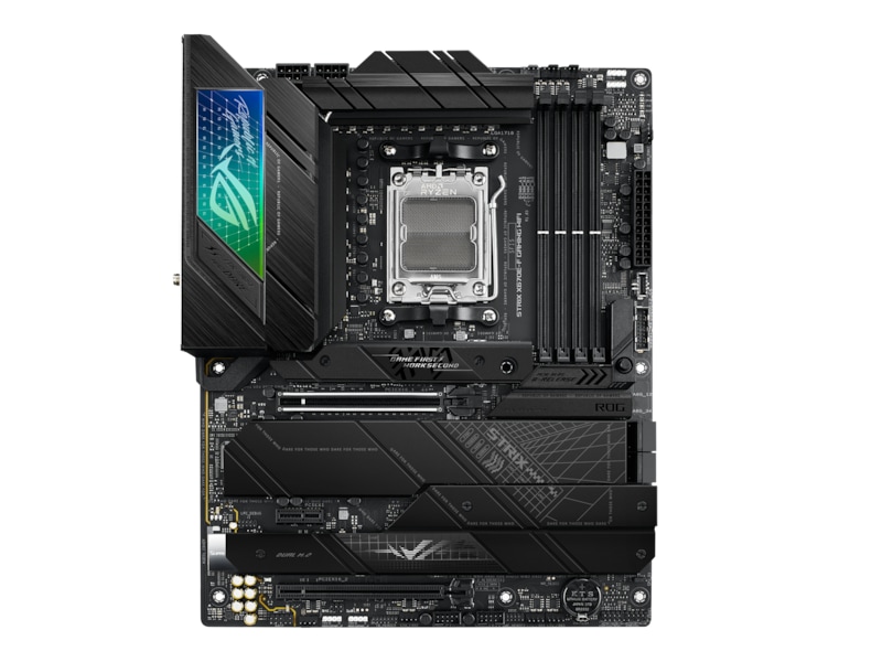 The ROG Strix X670E-F Gaming WiFi is the stealthy alter ego of the Strix X670E-A. A substantial power buff relays its inner demon, giving exclusive ROG overclocking utilities even more headroom to unleash the potential of AMD Ryzen™ 7000 Series processors. And its black PCB and dark metallic heatsinks aesthetically match a wider variety of system hardware and build themes, while a dash of customizable color on its shroud subtly announces an ROG presence in your AM5 build.