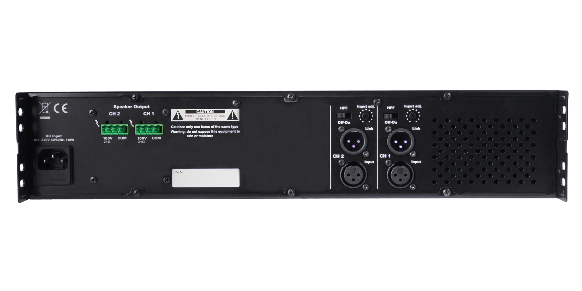 Audac CAP248 är ett 2-kanals 100V steg på 2 x 480W för större applikationer eller zonlösningar med många högtalare. CAP248 har balanserade ingångar och urkopplingsbart högpassfilter (400Hz) för varje kanal.