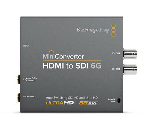 Mini Converter HDMI to SDI 6G includes everything you need to convert from HDMI devices to SDI video in SD, HD and Ultra HD video formats. With independent audio connections you can also embed SDI audio from HDMI, AES/EBU or balanced analog audio inputs. Mini Converter HDMI to SDI is the perfect solution to convert HDMI consumer cameras or computers to broadcast quality SDI.