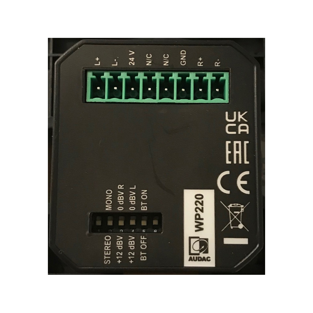 Audac WP220/W är en universal anslutningspanel med balanserad utgång, avsedd att anslutas till valfri line-ingång. Panelen är försedd med en Bluetooth-mottagare och en pairing-knapp med LED-indikator (som indikerar "redan ansluten" eller pairing-läge). Panelens Bluetooth-ID kan ändras i siffror och bokstäver för lättare identifiering. (Separat app för Android: Audac Bluetooth rename ID). OBS! Glöm ej aktivera BT med DIP-switch på baksidan!