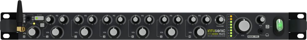 Intusonic Intuworx PAA71 är en multifunktionell preamp/mixer i 19 tum format. Fem ingångar är valbara mellan balanserad mik- eller obalanserad line-nivå. En dedikerad line-ingång (FOH) kan switchas mellan att använda teleingångarna (6,35mm) på baksidan, eller att använda Bluetooth-mottagaren/3,5mm teleingång på fronten (så fort 3,5mm teleingång på fronten används så kopplas Bluetooth-mottagaren bort). PAA71 har helt dedikerad mik-ingång med prioritet och Talk Over-funktion. Alla ingångar har 2-bands EQ (front) samt gain-reglage (baksidan).